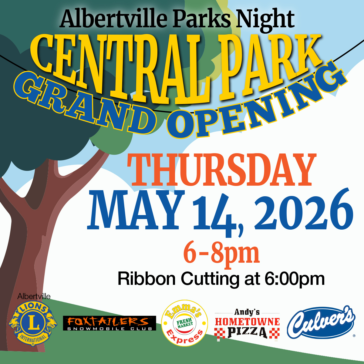 Join the City of Albertville for the grand opening of the new Central Park playground and water feature! In addition to the 6:00 ribbon cutting, this event will feature free hot dogs and other food items, a kid-friendly DJ, face painting, balloon artists, clowns, a fire truck, Albertville Royalty, and a visit from the Wright County Sheriff’s K-9 unit.