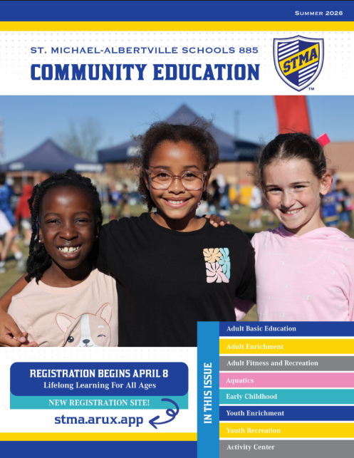 The Summer 2026 STMA Community Education brochure is headed to your mailbox soon, and it is packed FULL of fun activities going on in the St. Michael–Albertville area this summer! Check out the digital version of the brochure (linked below) for a sneak peek at youth sports, swim lessons, creative classes, preschool activities, and more!